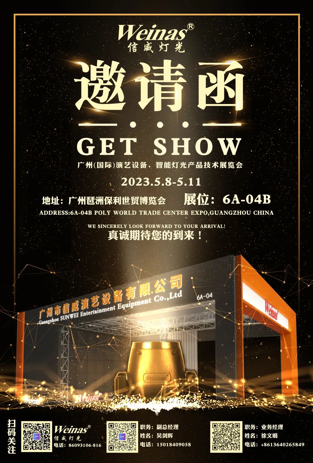 作為演藝設備行業最具影響力的專業燈光音響展,2023廣州(國際)演藝設備、智能聲光產品技術展覽會(簡稱“GETshow”)將于5月8日--11日在廣州保利世貿博覽館隆重舉辦!屆時,我們公司眾多的新品將悉數亮相,為業界展示最新的舞臺燈光科技成果,我們誠摯的邀請您能在百忙之中蒞臨廣州琶洲保利世貿博覽館6號館舉辦的第十屆廣州(國際)演藝設備、智能聲光產品技術展覽會(GET show),展位號6A-04B。